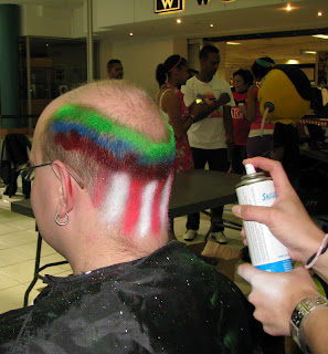 We were busy all morning with shoppers coming to either spray or shave their hair each with a different story or just wanting to support the organisation. I was designated photographer for the day and with a few glipses in my battery power, I managed to get some good shots. I did my fair share of sparying too and now my index finger is sporting a big swollen blister. Och a small price to pay for hanging out with some amazing folks.